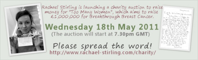 The wonderful owner of Rachael Stirling Online, Bonnie Gough, and Rachael Stirling herself, are launching a charity auction to raise money for the Too Many Women campaign for Breakthrough Breast Cancer. Up for grabs will be props, scripts, DVDs and signed memorabilia from BBC's Tipping The Velvet, which our very own Danny Mays also had a part in! There are also donations from Fiona Button, who starred alongside Danny in an episode of Outcasts recently. This is a very worthy cause, and also a great chance to get your hands on some special items!
